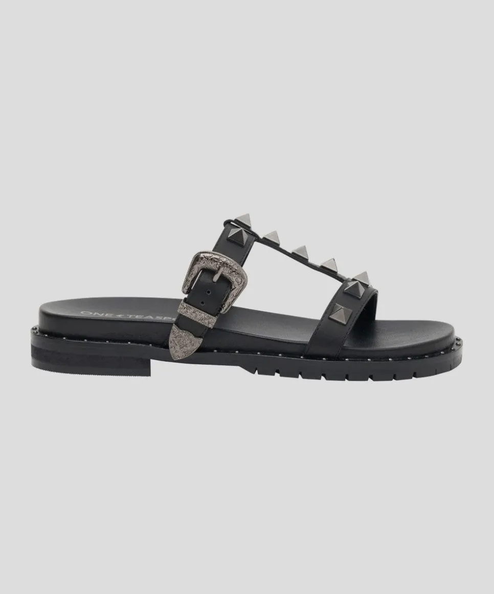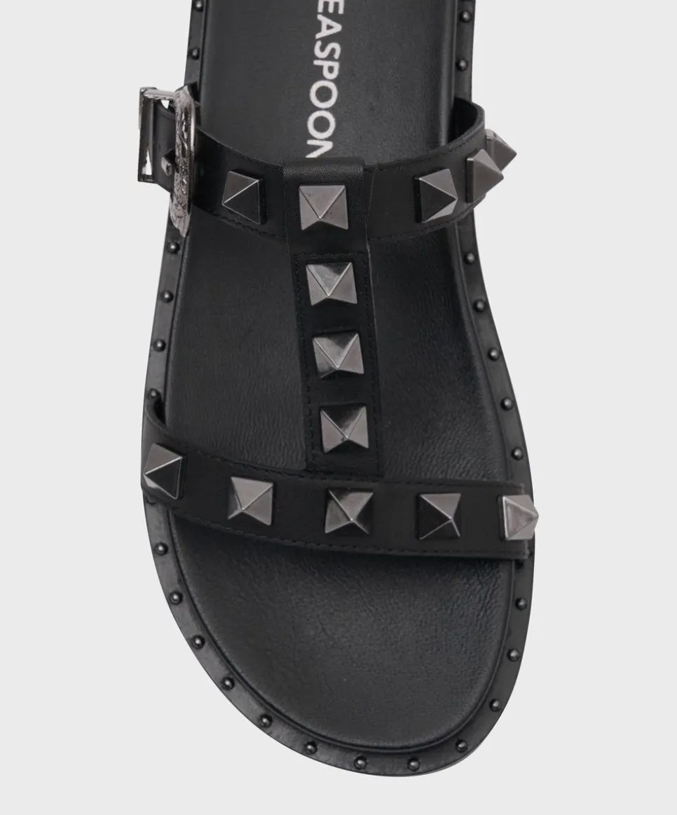 The Elise Studded Slide Features 100% Leather Upper And Gunmetal Studs And Buckle.