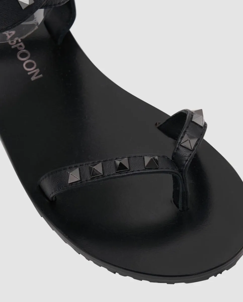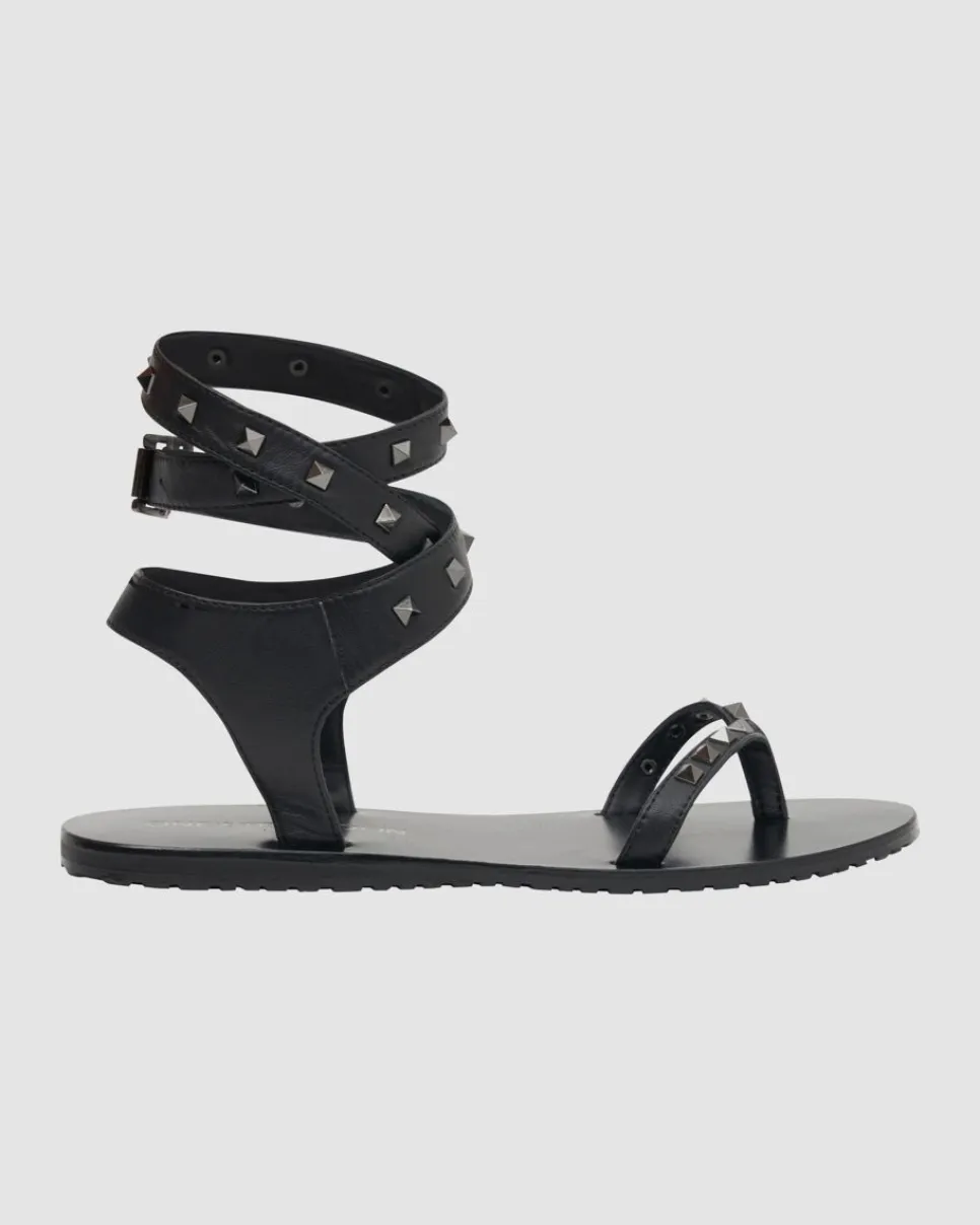 The Liza Studded Wrap Around Sandal Features 100% Leather Upper And Gunmetal Studs And Buckle.