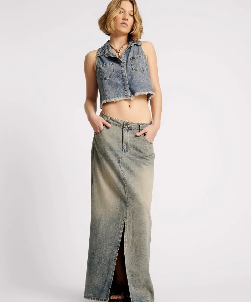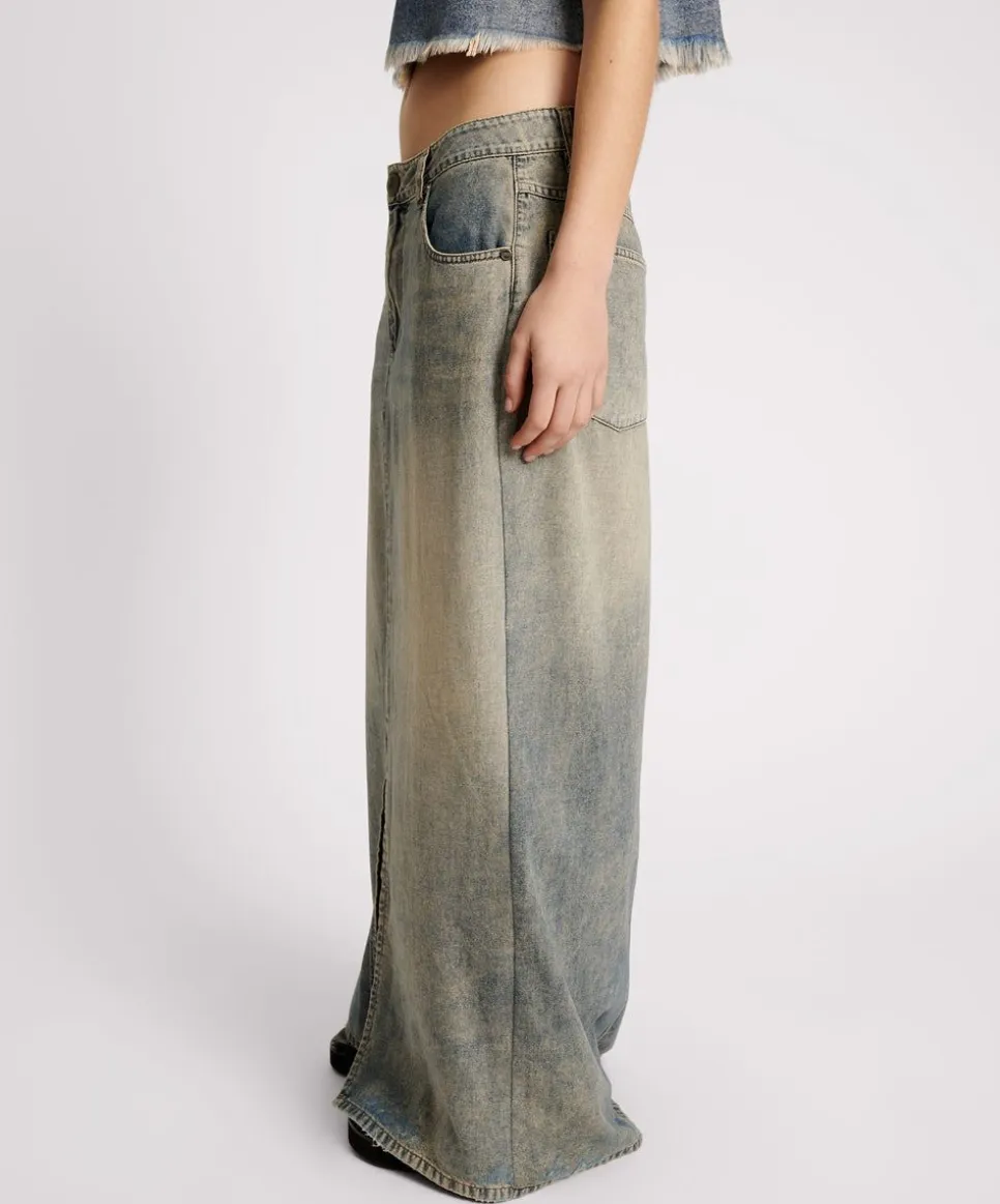 The Denim Column Skirt Is A Low To Mid Waist Maxi Skirt Semi Fitted Through The Hips. Featuring A Centre Front Split And A Zip Fly.