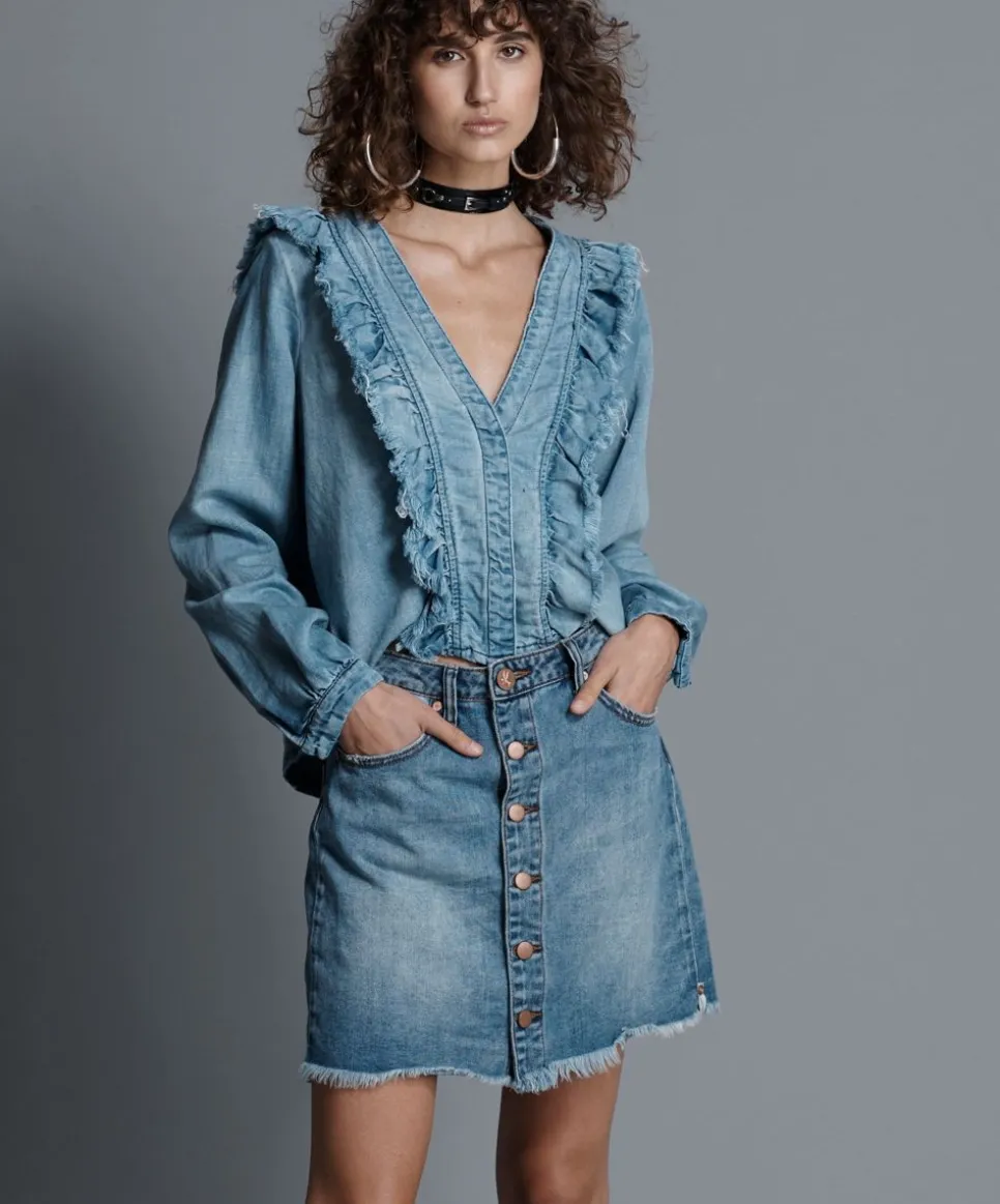 The Venice Viper Skirt Is A High Waist, A-Line Denim Skirt With Button-Up Front. Made From A Rigid Denim In A Bright Blue Wash. Fabric: 100% Cotton. Model Wears A Size 26. Approx. Side Seam Length Inc. Waistband (Size 26): 42Cm.