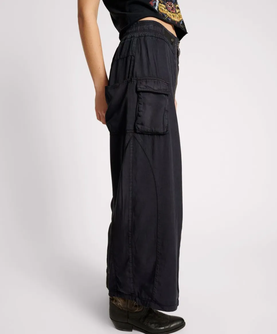 Introducing The Washed Black Tencel Parachute Skirt. A 90S Inspired Statement Skirt. Low Waisted With A Relaxed And Loose Fit. Featuring Large Utility Pockets, Adjustable Waist Tabs And An Elasticated Waist.