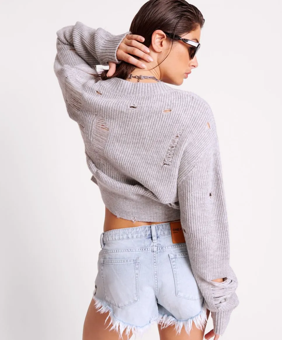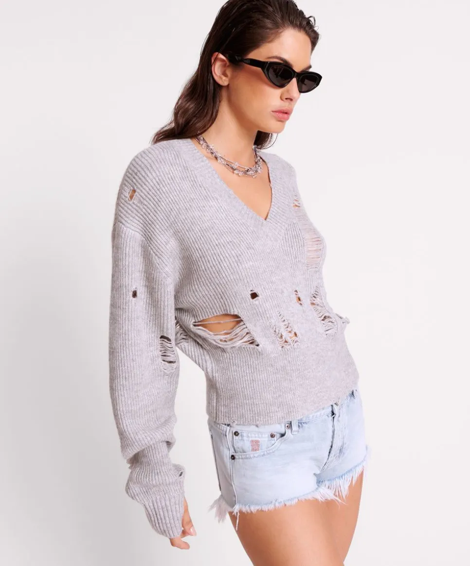 The Laddered V-Neck Distressed Sweater Will Be Your New Go To. Featuring A Deep V Neck, Thumb Holes And Highly Distressed Laddering For Extra Texture. True To Size, Cropped In A Classic Grey Marle.