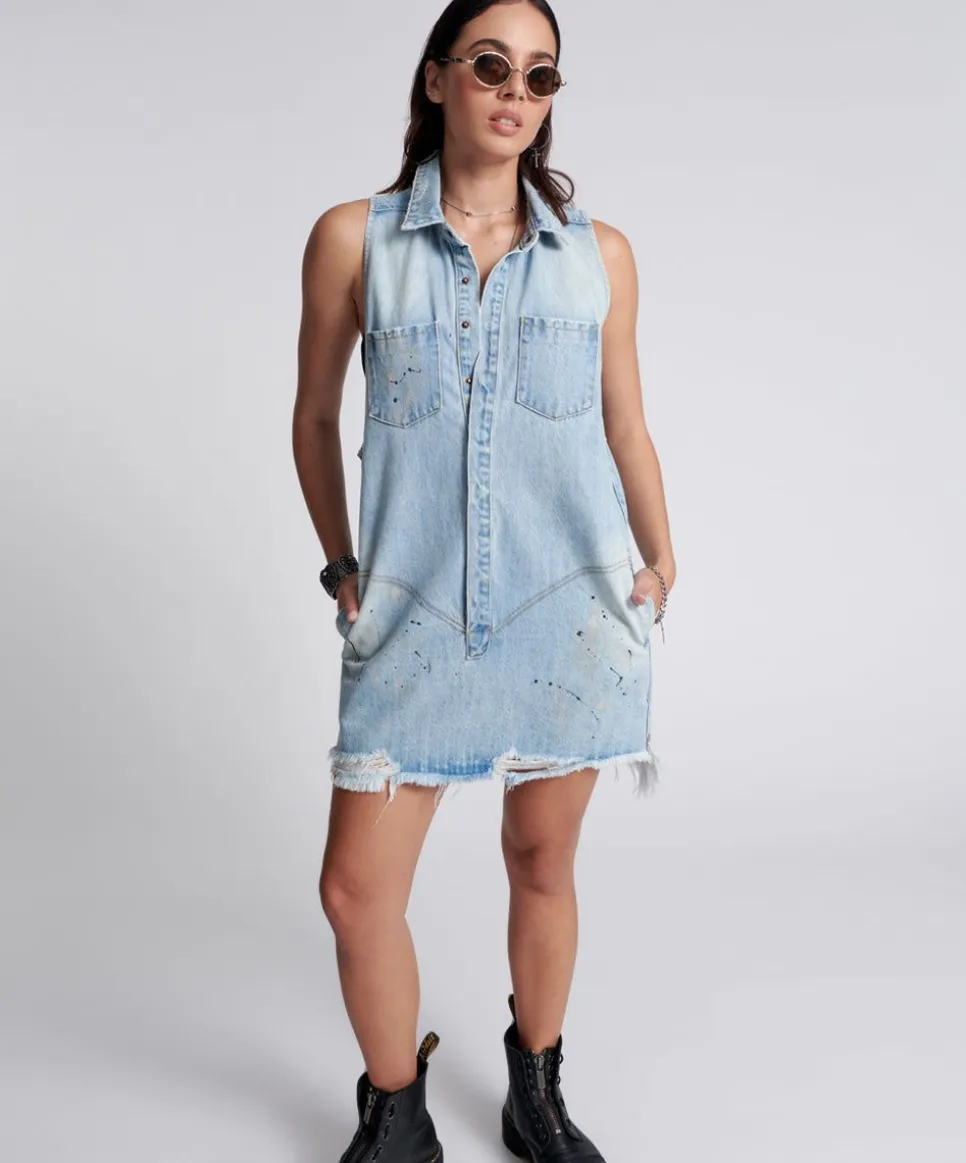 The Best Blue Mini Braxton Dress – The Short Denim Dress With The Utility Edge. Relaxed In Fit With Cut Away Arms And Hems. The Ultimate Ask-No-Questions, Take-No-Prisoners Utility Dress.