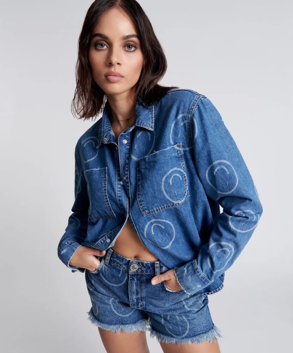 We’Re All Smiles In The All Smiles Soho Shirt. Soft Hand Feel Made With 100% Cotton. Finished With Oversized Pockets, And Edgy Cuff, Pockets & Collar Distressing. Pearl Snap Button Closure. Oversized & Cool. The Perfect Statement Denim Shirt.
