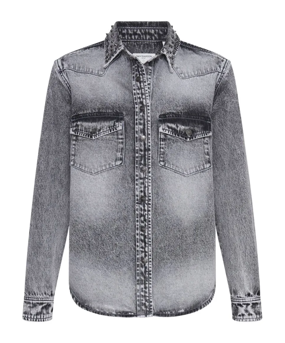 The Slate Acid Studded Denim Shirt Is A Western-Inspired Cowboy Fit Denim Shirt. Aq True To Size Fit Featuring Contrast Blue Stitching And Spike Studs On The Collar.