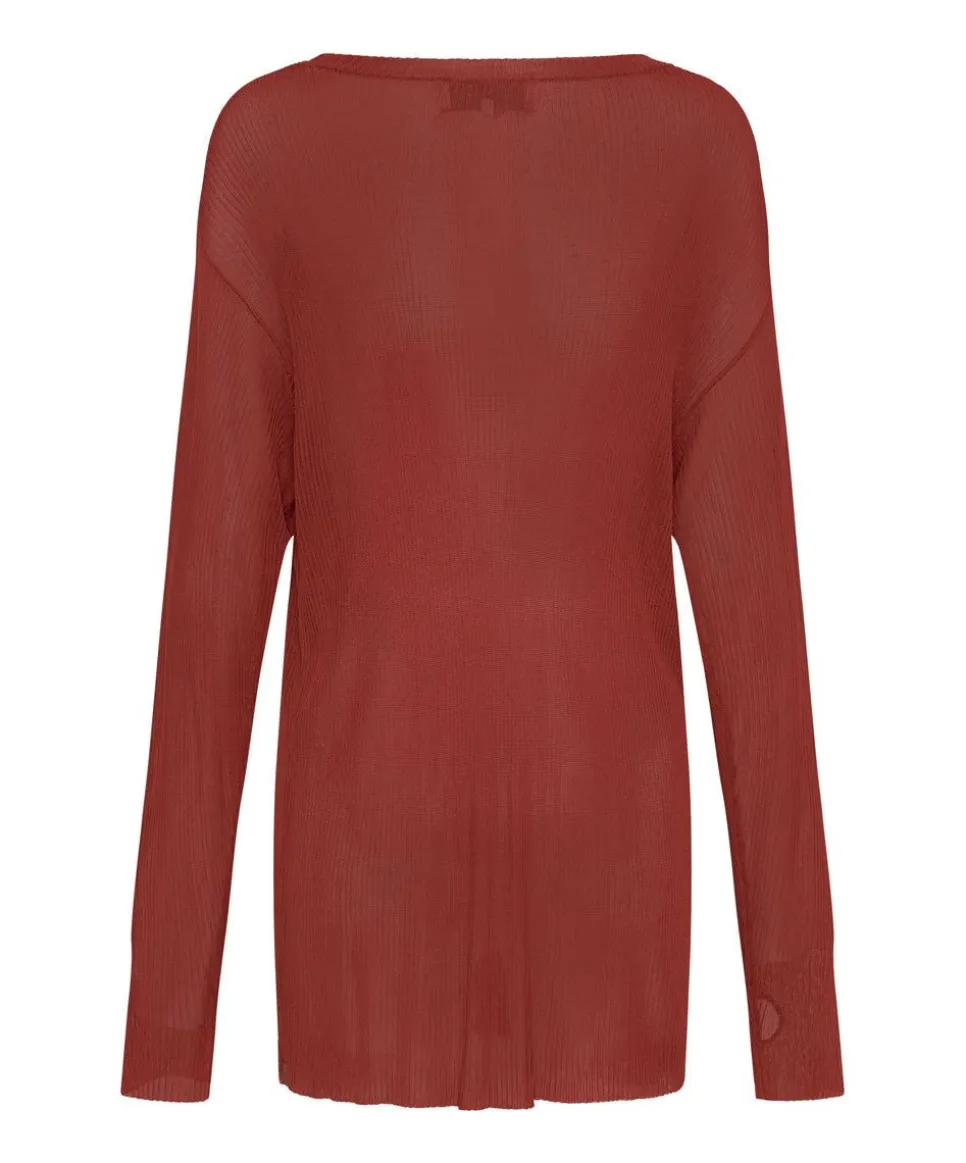 The Amity Sheer Rib Knit Top Is An Oversized Classic Rib Knit. Sheer And Gorgeous Rust Tones Offset A Semi-Wide Neck. A Delicious Basic That Pairs With Everything.