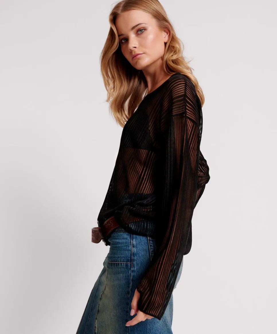 Presenting The Black Ladder Stripe Sheer Knit Sweater. The Perfect Sheer Sweater Designed For Any Time, Any Day, Any Night. Features A Solid And Sheer Ladder Effect. Crafted From A Tencel Mix And Is Stretchy For The Perfect Fit.