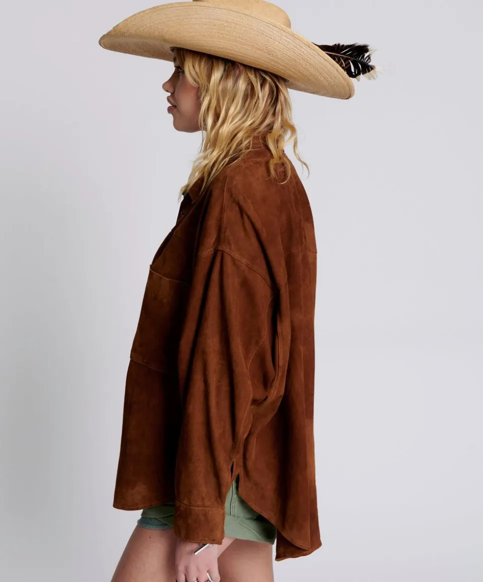 The Suede Daria Shacket Is Our Super Oversized Marfa Suede Shirt-Jacket With Batwing Sleeves, Huge Pockets & A Curved Hem Line. Longer At Back. Looks Great With The Sleeves Rolled And Pushed Up. Can Be Sized Down For A Smaller Look – But We Love It Just The Way It Is. Crafted From 100% Genuine Sheep Leather – Wear It As A Jacket Or A Shirt – Your Choice!