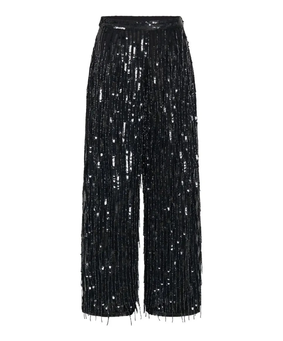 The Necessity Party Pants Are Your New Necessity! Black, Hand Beaded, Flippy, Funky And Cool. With A Slinky, Sexy Wide Leg And High Waist, This Is Studio 54 On Steroids! Crafted With. A Sequin Mesh Base For Total Comfort, Fully Lined, And Finished With All-Over Hand-Applied Beaded Fringing.