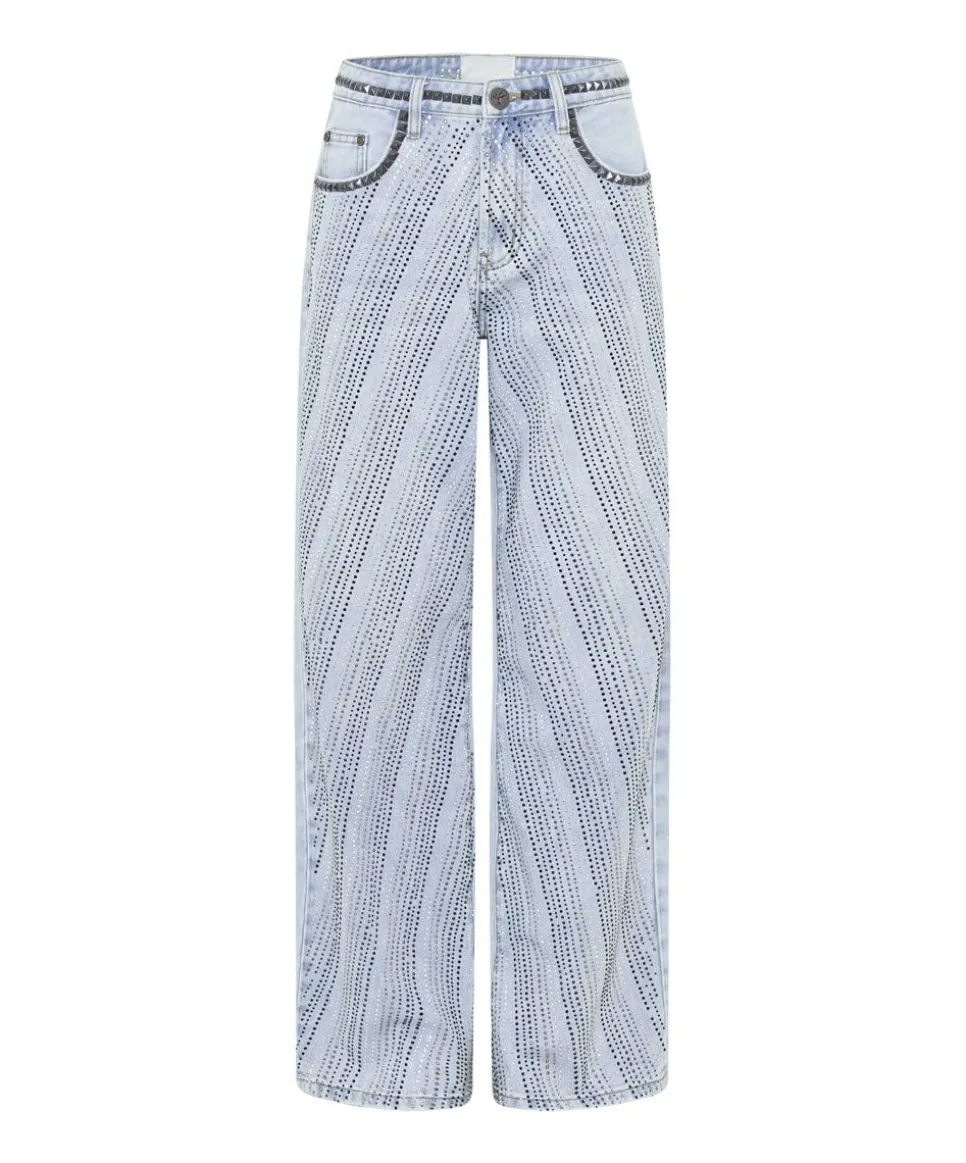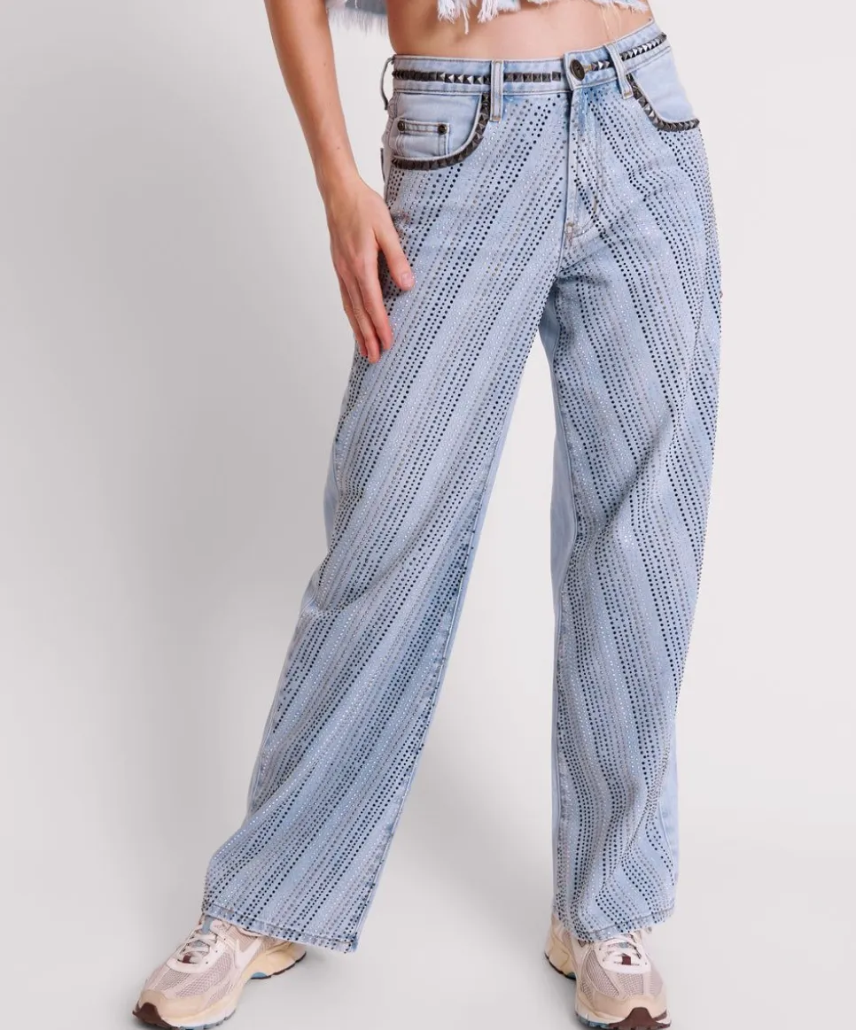 Blue Galaxy Is A Perfect Light Tone Blue Denim Colour Wash With Low-Level Bleaching And Fading For A Classically Crisp Aesthetic. Featuring A Symphony Of 8 Different Jewels Across The Entire Front Of Short And And Back Yoke. Hand Applied Pyramid Studs Around The Waist And Pockets. A Newly Born Classic.