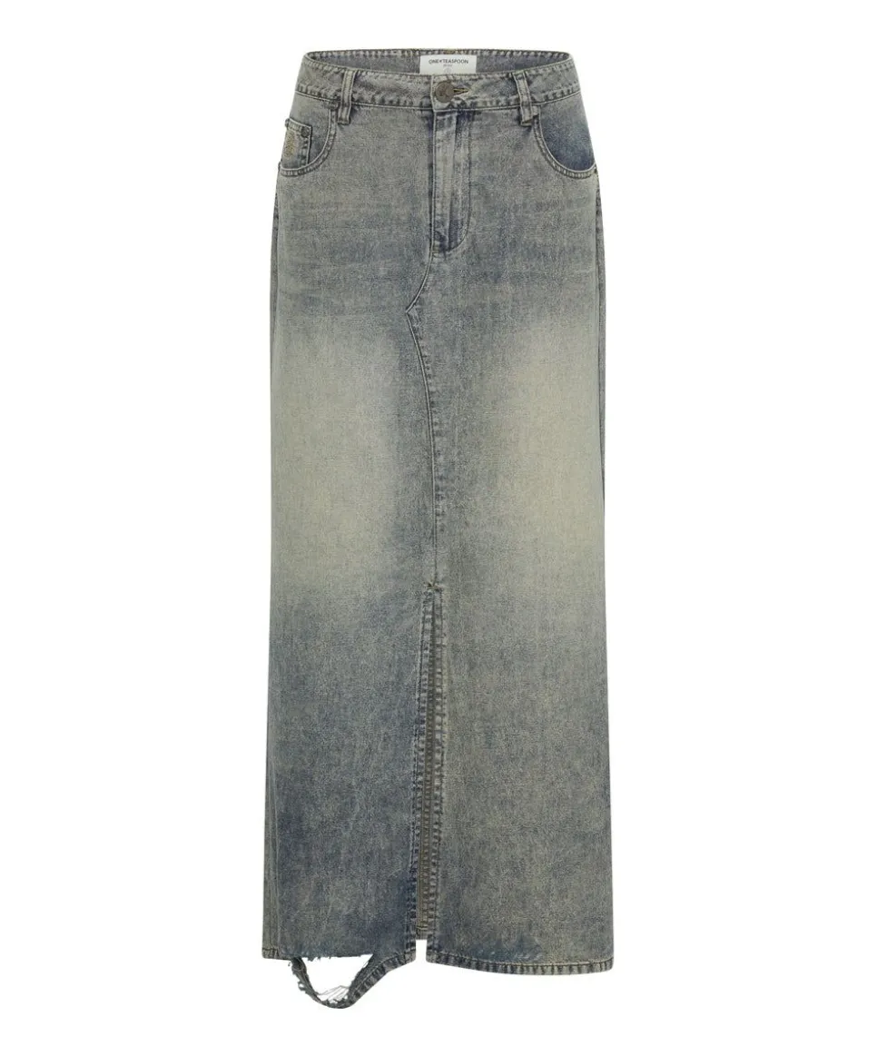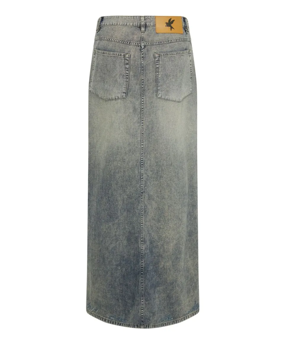 The Denim Column Skirt Is A Low To Mid Waist Maxi Skirt Semi Fitted Through The Hips. Featuring A Centre Front Split And A Zip Fly.