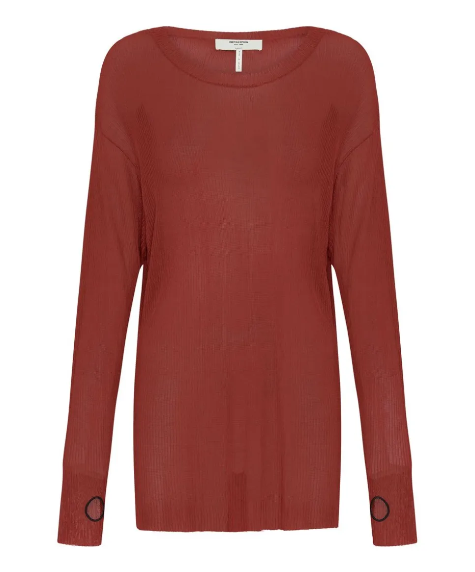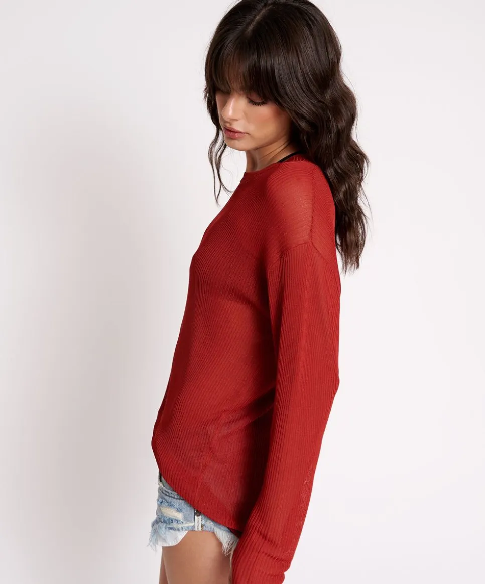 The Amity Sheer Rib Knit Top Is An Oversized Classic Rib Knit. Sheer And Gorgeous Rust Tones Offset A Semi-Wide Neck. A Delicious Basic That Pairs With Everything.